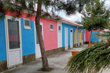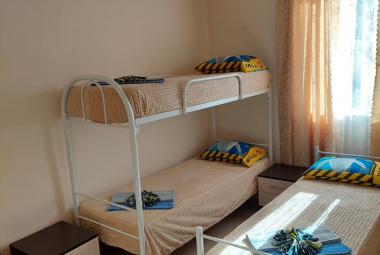 Размещение: дети размещаются в одноэтажных корпусах по 4-6 человек в номере с удобствами (душ, туалет), вход в номера с улицы. Все комнаты, в которых проживают отдыхающие дети, укомплектованы прикроватными тумбочками по количеству проживающих, платяным шкафом, обувницей. На окнах установлены москитные сетки, есть тюлевые и теневые занавески. Установлена современная система пожарной безопасности.
